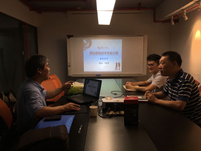 摄影学院刘院长(左)与河马公司动画学院运营总监郭伟(右)会面洽谈
