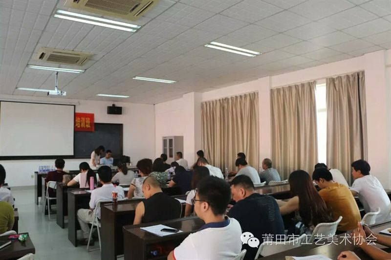 莆田市工艺美术协会组织的2016年工艺美术系列中初级职称课程培训班于近期在黄石工艺城展示中心三层大专班教室正式开班。taptap点点登陆艺术设计学院范楠楠副院长、招生办黄佛保副主任、陈旭讲师到场授课。本期中初级职称培训班共64名学员参加三门课程进修培训。
